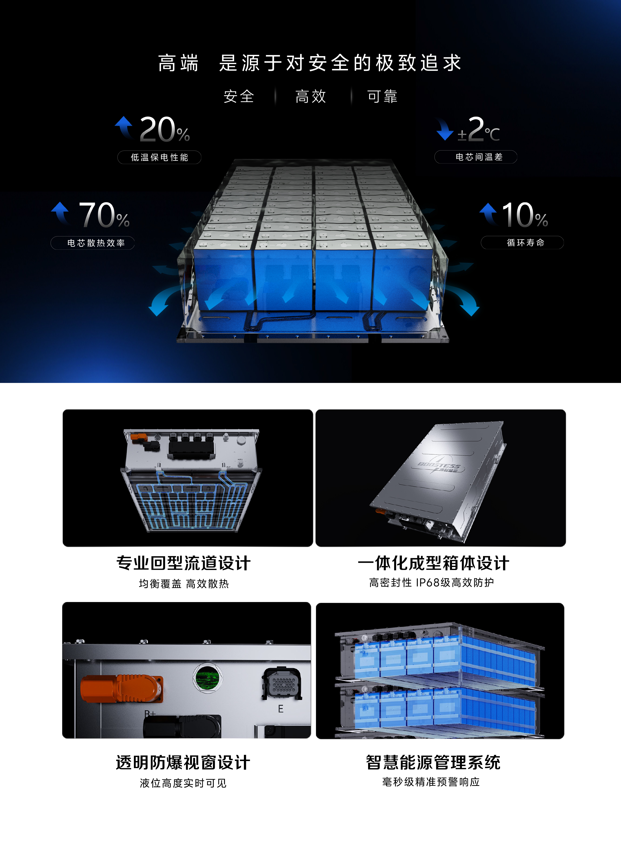 极致安全,全场景适配——泰山系列261kWh全浸没式储能系统,专为 AIDC、数据中心等高安全场景打造,以极致安全守护算力稳定。采用全浸没式设计 + 复合阻燃浸没液,从源头杜绝电池自燃;创新孔隙换热与回型流道,散热效率提升 70%,电芯温差≤±2℃,低温保电性能升 20%。IP68 高密封性加持,配合毫秒级响应,避免 AIDC 训练断电损失,还可削峰填谷降运营成本。依托博时技术积累,完美适配高功率密度需求,为智算核心筑牢能源安全屏障。